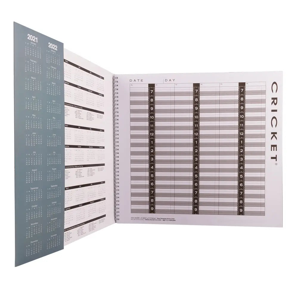 The product features a flip-out calendar with major holidays listed for each year, providing easy daily reference. The appointment times are listed from 7 AM to 9 PM, with shaded sections every half hour for cross referencing. The monthly planner section has extra large spacing and the "Stay Put" double strand metal binding ensures a flat layout.