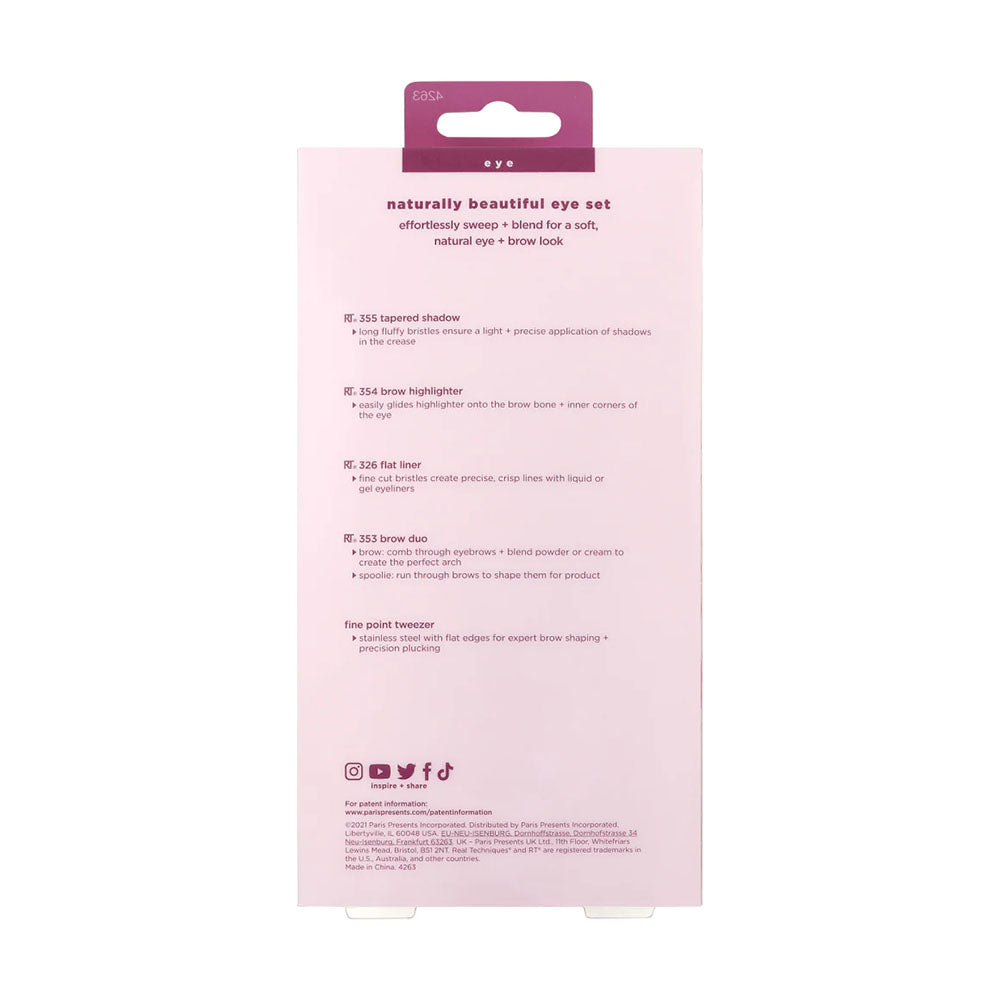 Effortlessly sweep and blend for a soft, natural eye and brow look with the Real Techniques Naturally Beautiful Eye Makeup Brush Set. This set includes five new eye brushes and tools designed to help create the no-makeup makeup look. Brushes can all be used with cream and powder shadows, liquid or gel eyeliners, brow pomade, and brow makeup. Set Includes a tapered shadow brush, brow highlighter brush, flat liner brush, brow comb, brow spoolie, and fine point tweezers.